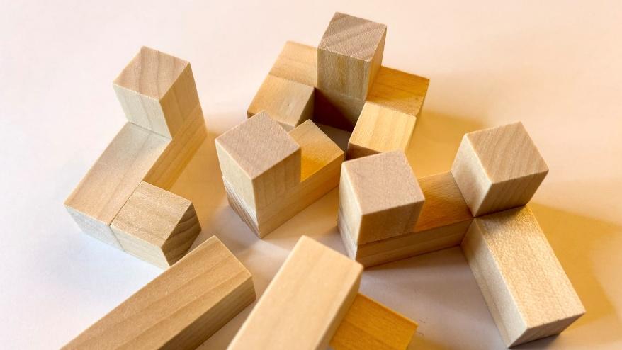 立体的な木製ピース6つを使って、指定の形に組む問題でした。